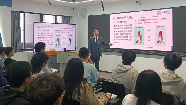 随着热烈的掌声渐渐平息,开班仪式圆满落幕。紧接着,备受期待的《数字孪生导论》第一课正式拉开序幕。师占群教授为同学们深入讲解了数字孪生在复杂装备智能制造中的应用,包括其核心概念、关键模型和系统架构。他的精彩讲授为同学们提供了课程的全面概览,让大家对即将展开的微专业旅程有了明确的认识和期待。