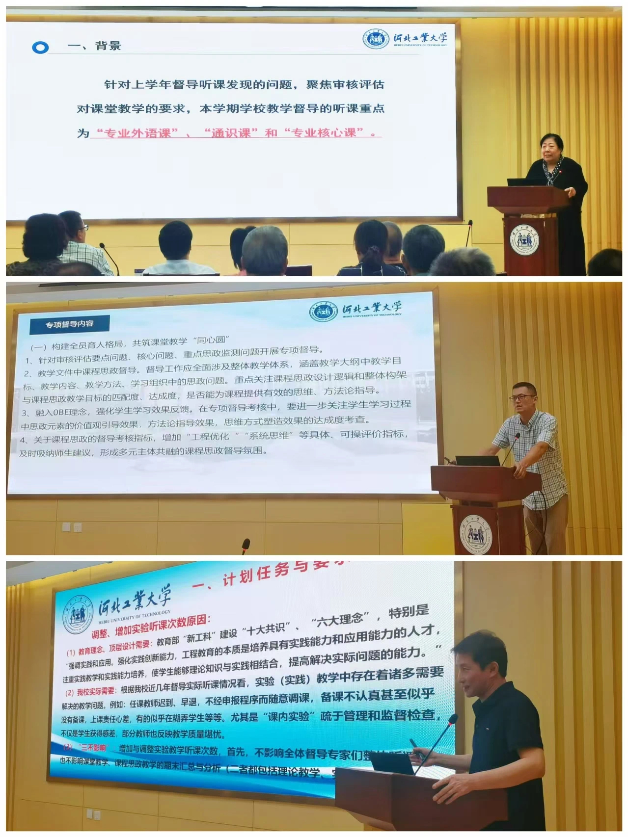 会上,刘丽冰、苑帅民、魏怀鹏、侯向丹、李颖、刘剑飞分别就本学期督导听课计划、课程思政督导、实验(实践)课程督导、试卷专项督导、研究生教育教学督导、督导自身建设与学习等方面工作进行了详细说明,明确了各项督导工作的目标、具体任务和安排,并依据上学期督导过程中发现重点问题,针对本学期相应工作,提出了指导性建议。本学期督导工作将结合新一轮教育教学审核评估工作要求,覆盖本科和研究生人才培养关键环节,旨在通过系统性的督查与指导,充分加强人才培养规范性、提升教师教育教学水平。