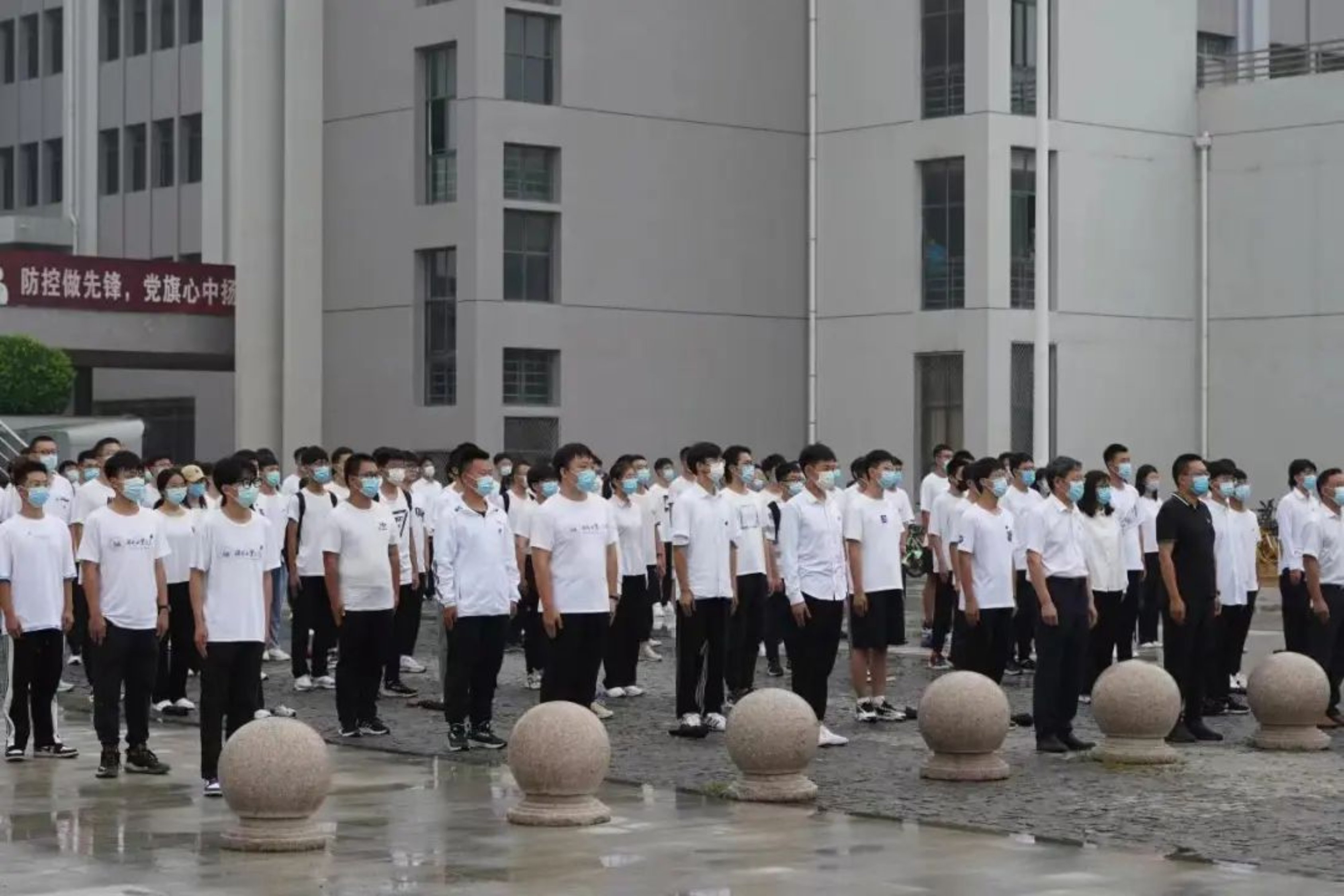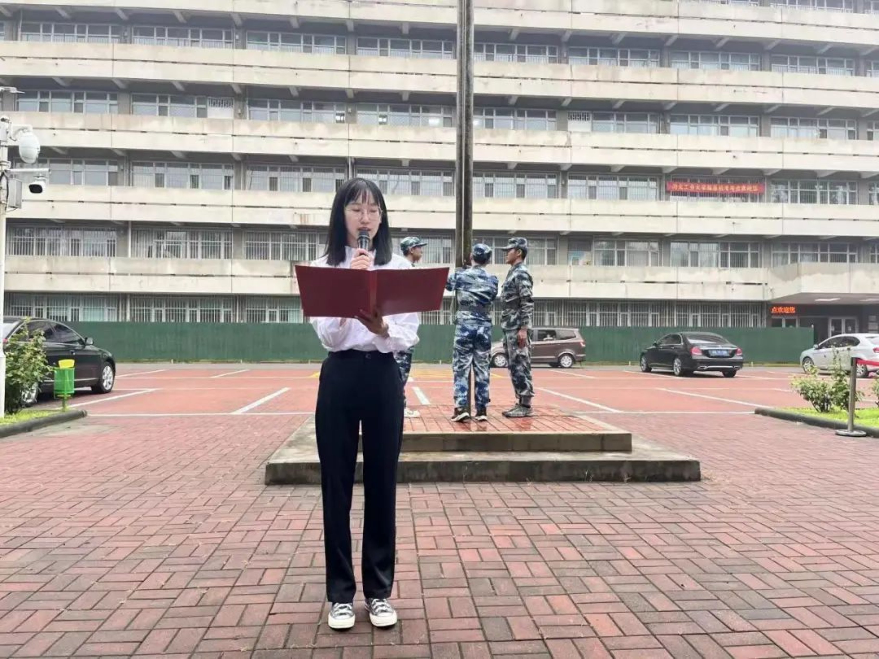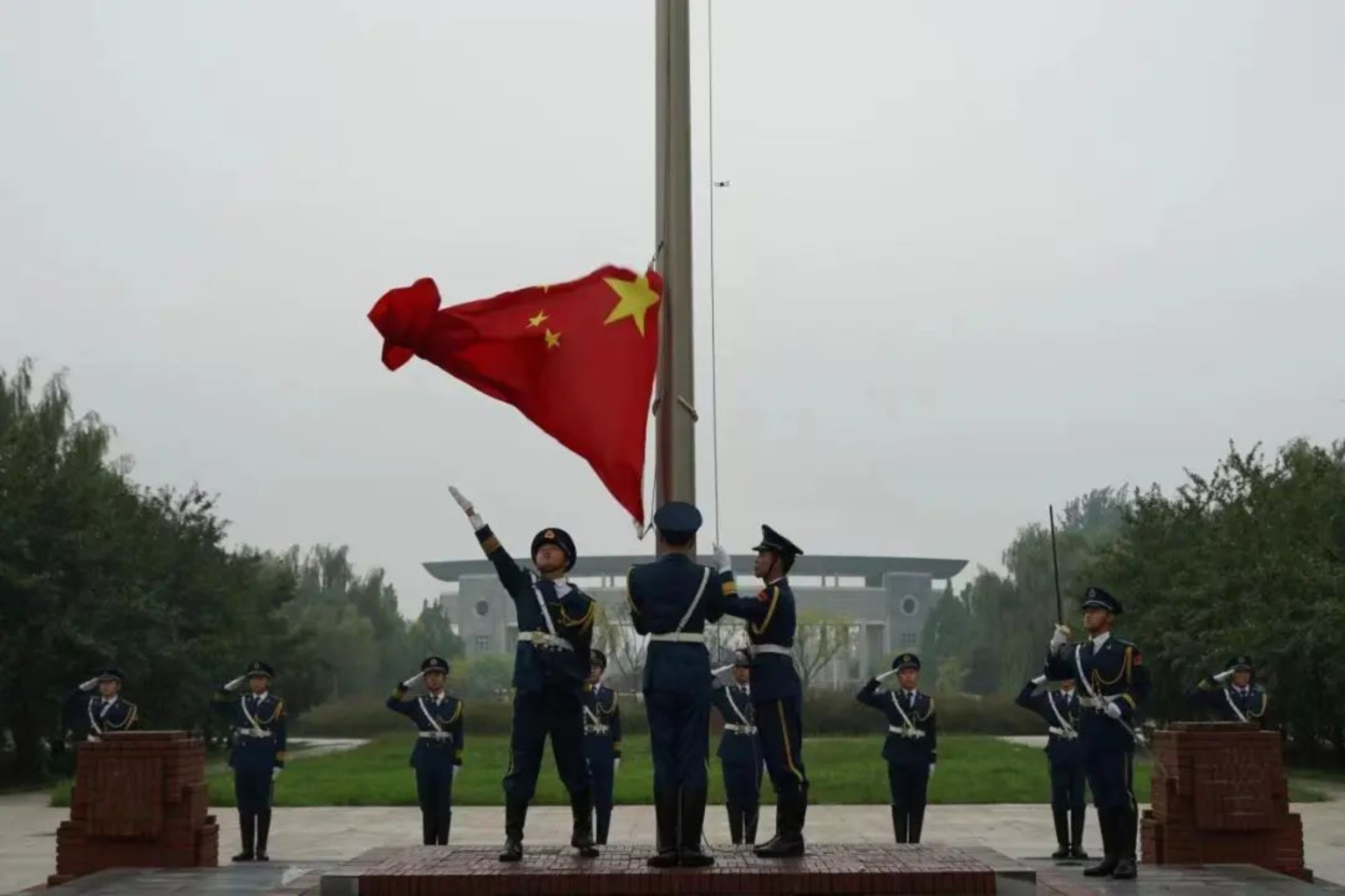 夏末的清晨,细雨带来了些许凉意,师生们着装整齐、热情高涨,鲜艳的五星红旗在河北工业大学蓝天国旗护卫队的护卫下,伴随着嘹亮的国歌,在北辰校区、红桥校区东院、南院、北院冉冉升起,迎风飘扬。