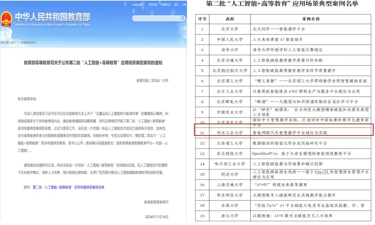 发布日期:2024-11-26 作者:河北工业大学本科教育 访问量:近日,教育部公布了第二批32个“人工智能+高等教育”应用场景典型案例,我校推荐的案例“智能网联汽车智慧教学平台建设与实践”成功上榜。这一成绩不仅是对我校在人工智能与高等教育融合领域努力的认可,也标志着我校在促进人工智能技术与教学实践深度融合方面取得了重要进展。