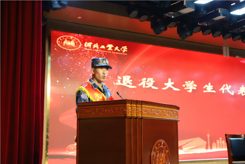 机械工程学院李银鹏同学作为退役大学生代表发言,讲述了他的参军经历,向我们展示了退役学子的精神风貌,向我们诠释了河工人的“退伍不褪色,退役不退志”。当代大学生肩负着维护国家安全和建设祖国美好明天的重任,两年的军旅生活,为他们的青春增添了绿色的篇章,若有战,召必回!是他们对祖国的承诺,也是他们对自己的承诺!
