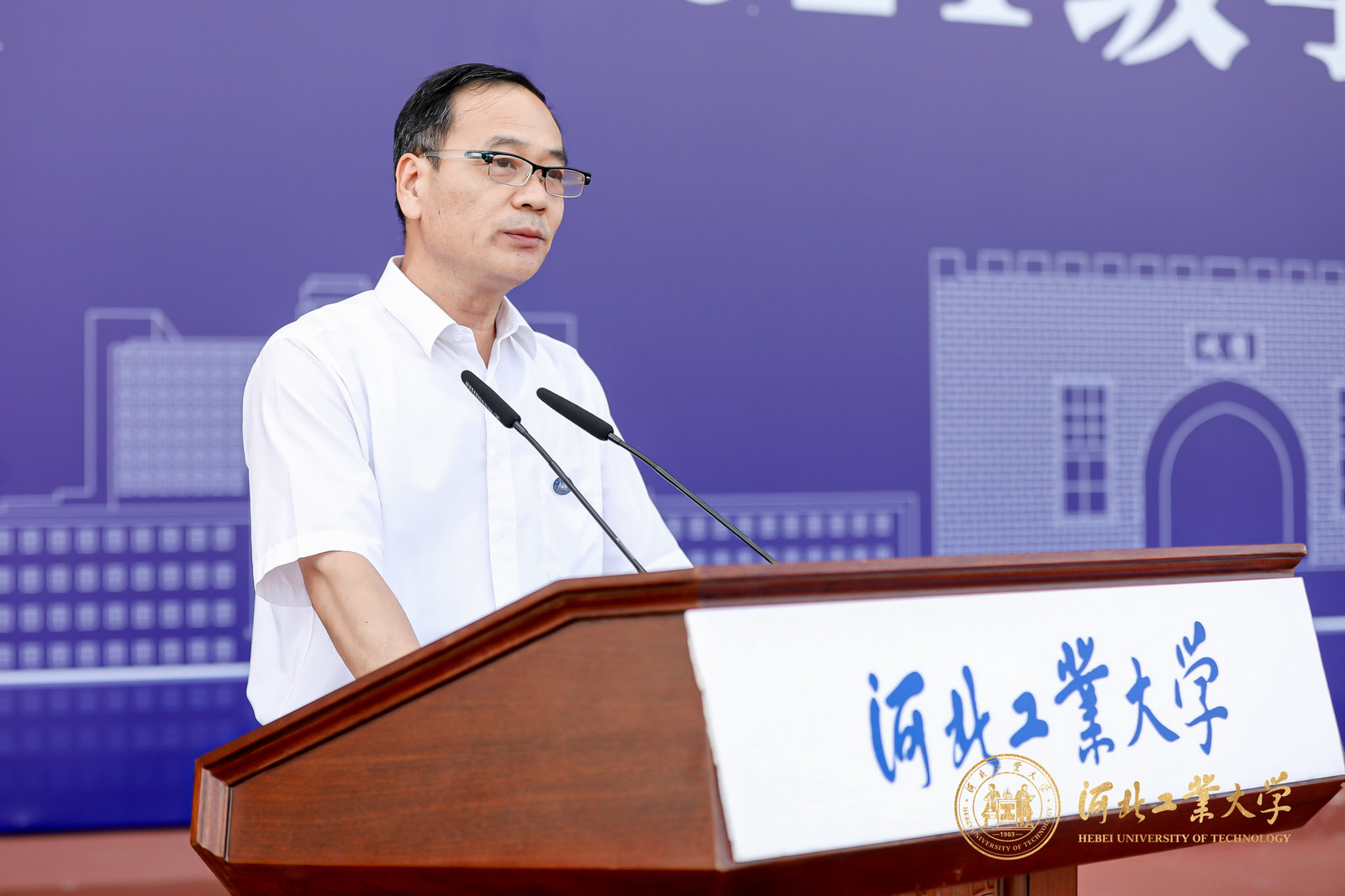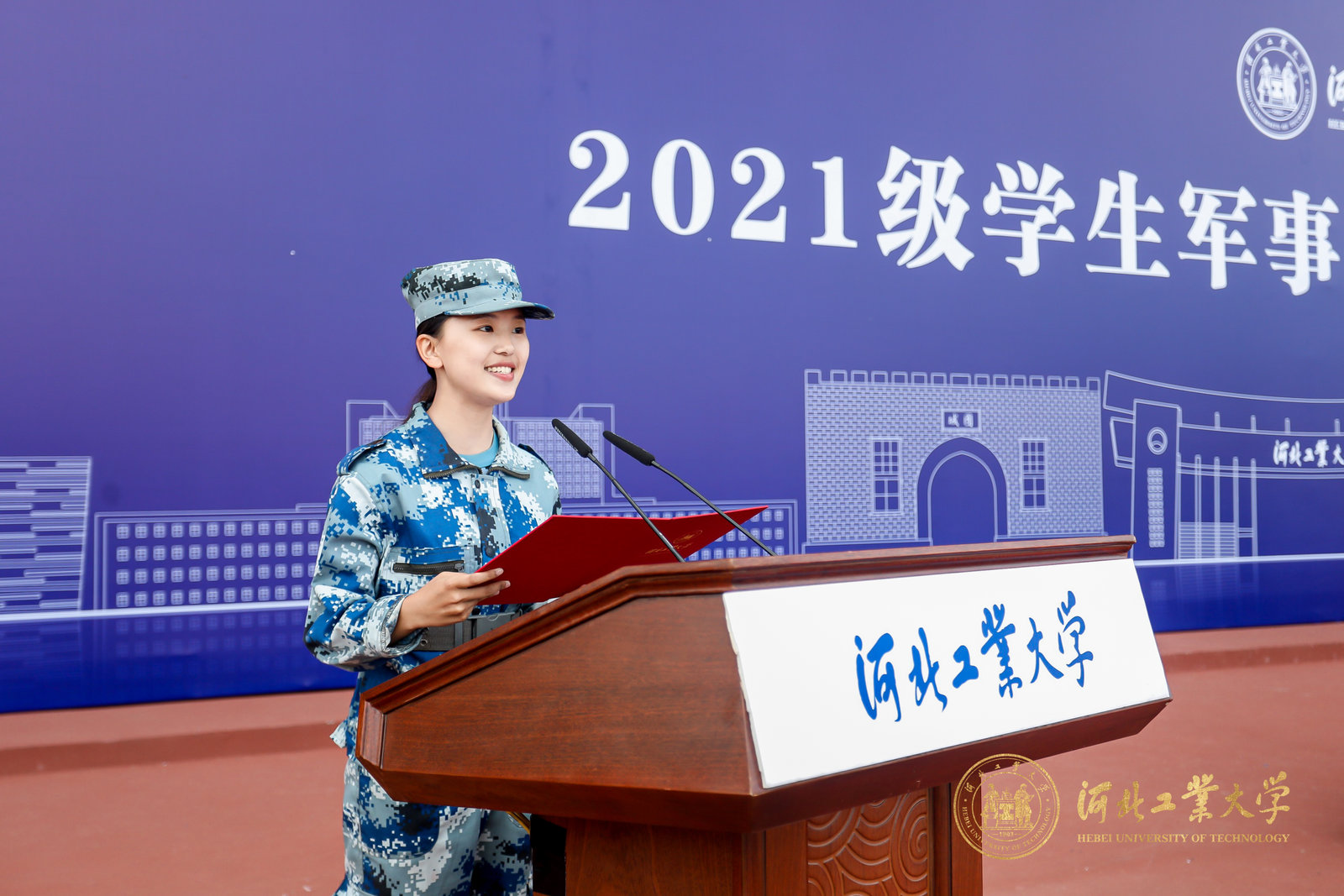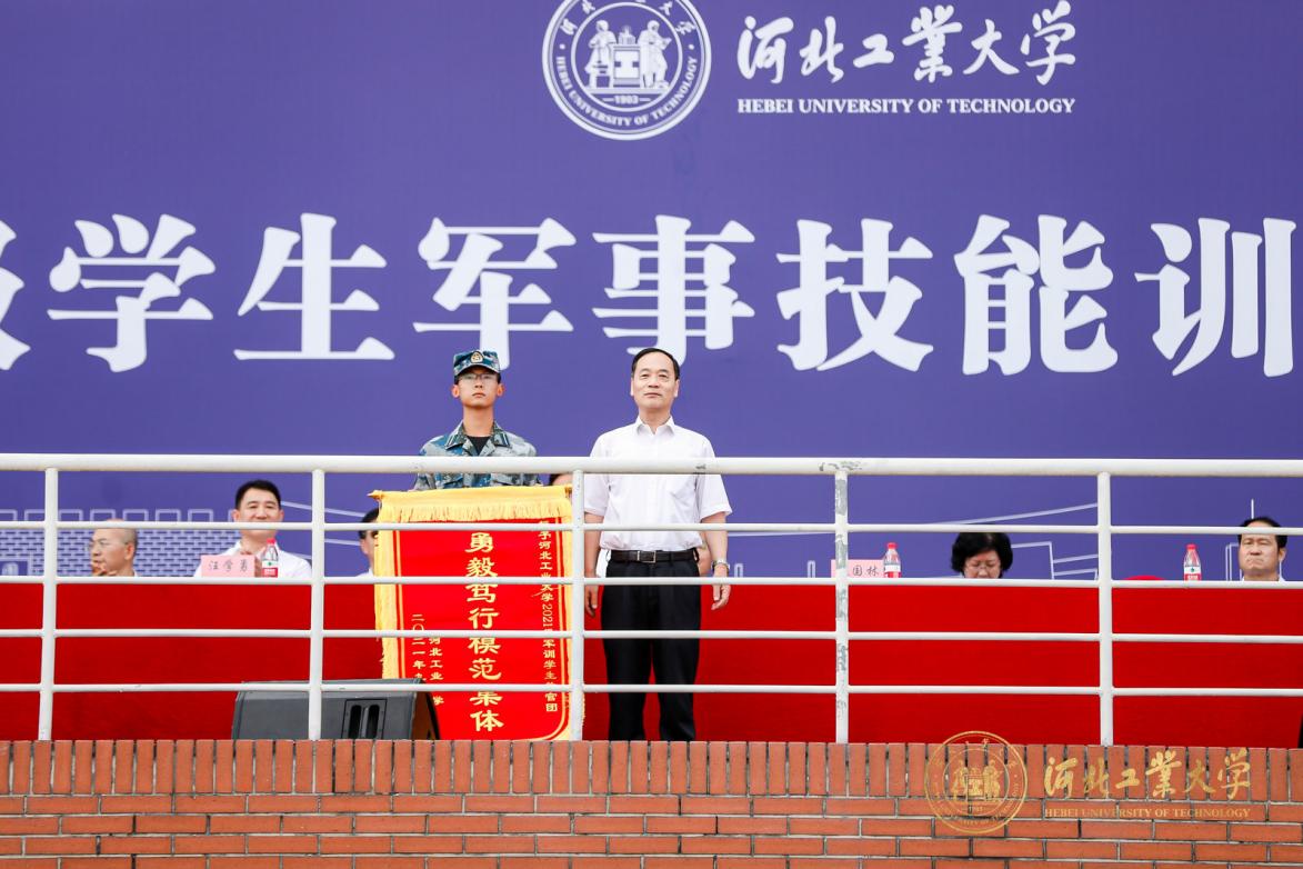 最后,河北工业大学党委常委、副校长段国林发表讲话,充分肯定了2021级学生的军训成果,希望同学们坚定理想信念,心怀报国之志;坚持脚踏实地,夯实发展之基;坚持立德修身,矢志追求卓越。要牢记习近平总书记“立大志、明大德、成大才、担大任”的殷切嘱托,用青春和汗水创造无愧于新时代的新奇迹,为建成现代化强国、实现民族伟大复兴和祖国完全统一贡献青春力量。
